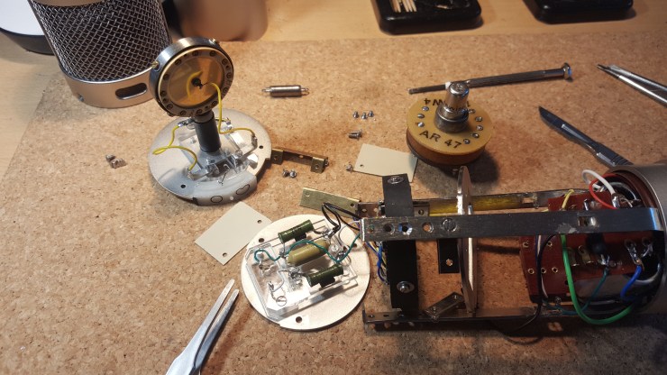 Pour ces microphones, je nettoie les capsules, le corps, traite la majeure partie de ses pièces internes en ultrason, je re-fabrique les éléments internes détériorés si besoin ou bien les remplace par les composants actuels les plus proches. les composants passifs ne sont remplacés que lorsque cela est absolument nécessaire.